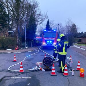 In einem Einfamilienhaus ist durch eine defekte Wasserleitung, der Keller mit Wasser voll gelaufen. Nach dem der Energieversorger das Wohnhaus stromlos geschaltet und das Wasserwerk das Wasser abgestellt hatte, pumpten wir das Wasser mit zwei Tauchpumpen aus dem Keller.